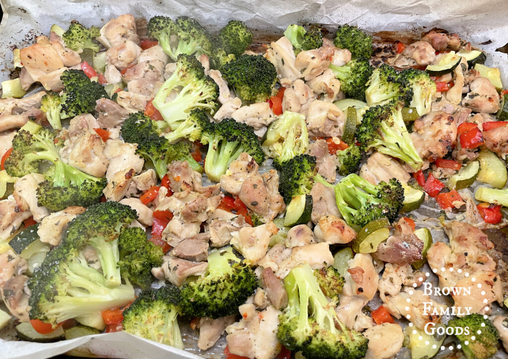 Roast for 25-35 minutes, or until the chicken is cooked through and the vegetables are tender.