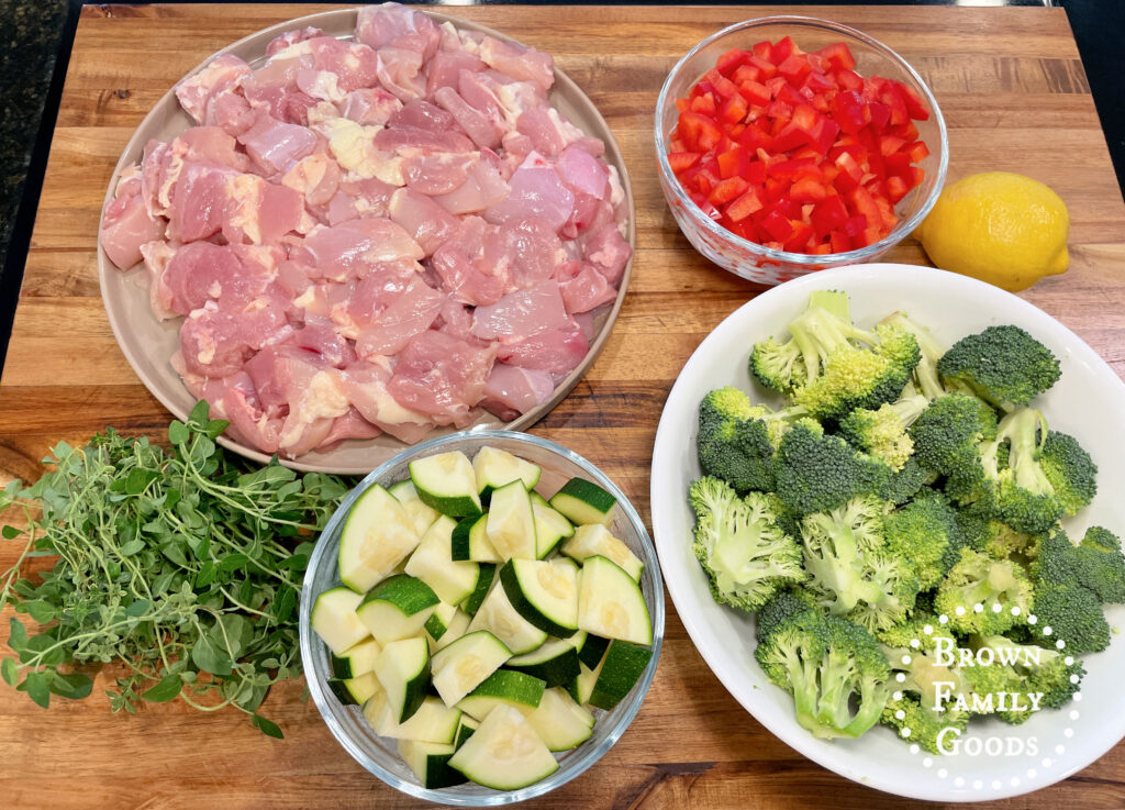 In a large bowl, toss the chicken, broccoli, zucchini, and bell pepper with olive oil, minced garlic, oregano, thyme, salt, and pepper.