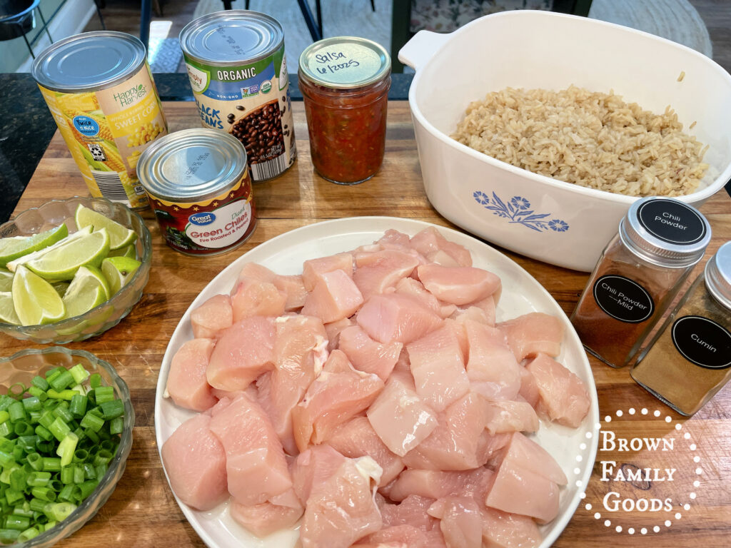 3. In a large bowl, combine the shredded chicken, cooked brown rice, black beans, corn, diced green chiles, and spices (cumin, chili powder, salt, and pepper).