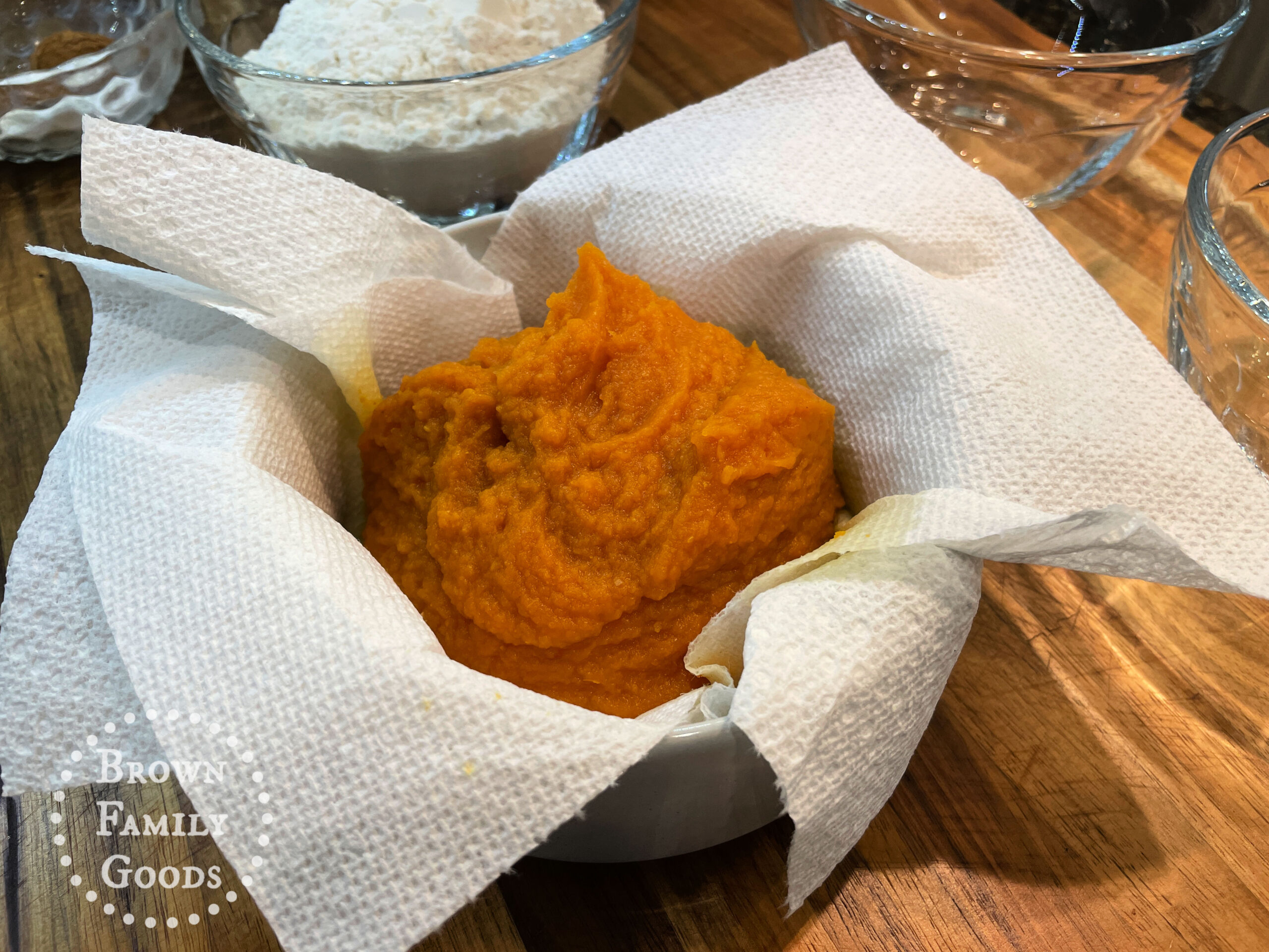 Line a small bowl with 2 sheets of paper towel. Place the measured pumpkin puree in the bowl. Use another sheet of paper towel to press down and blot the excess moisture from the pumpkin puree. After blotting you'll have about 1 Cup of pumpkin puree.