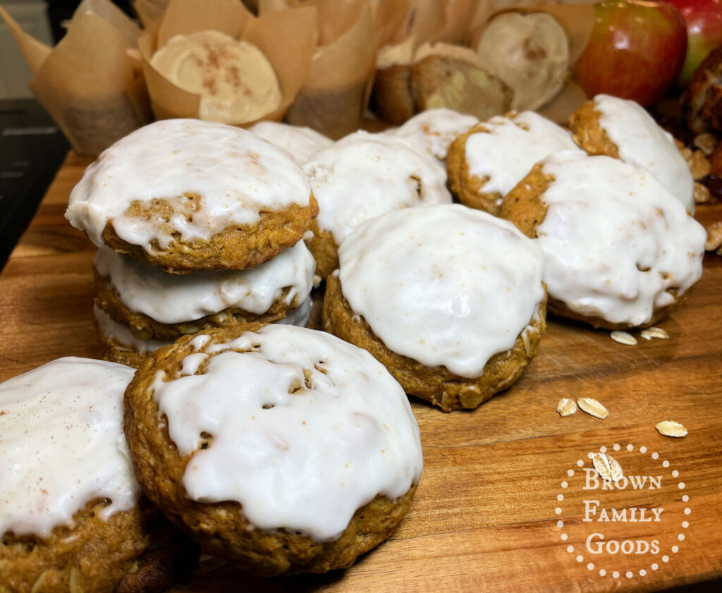 Pumpkin Oat Brown Butter Cookies with White Glaze Stacked on a Wooden Board pinit View Gallery 3 photos