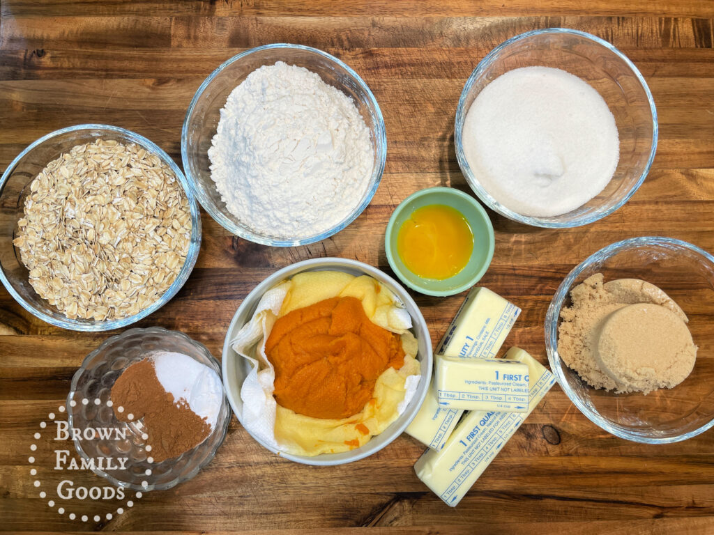 1. In a large bowl mix together the oats, flour, baking soda, salt, cinnamon, and pumpkin pie spice.